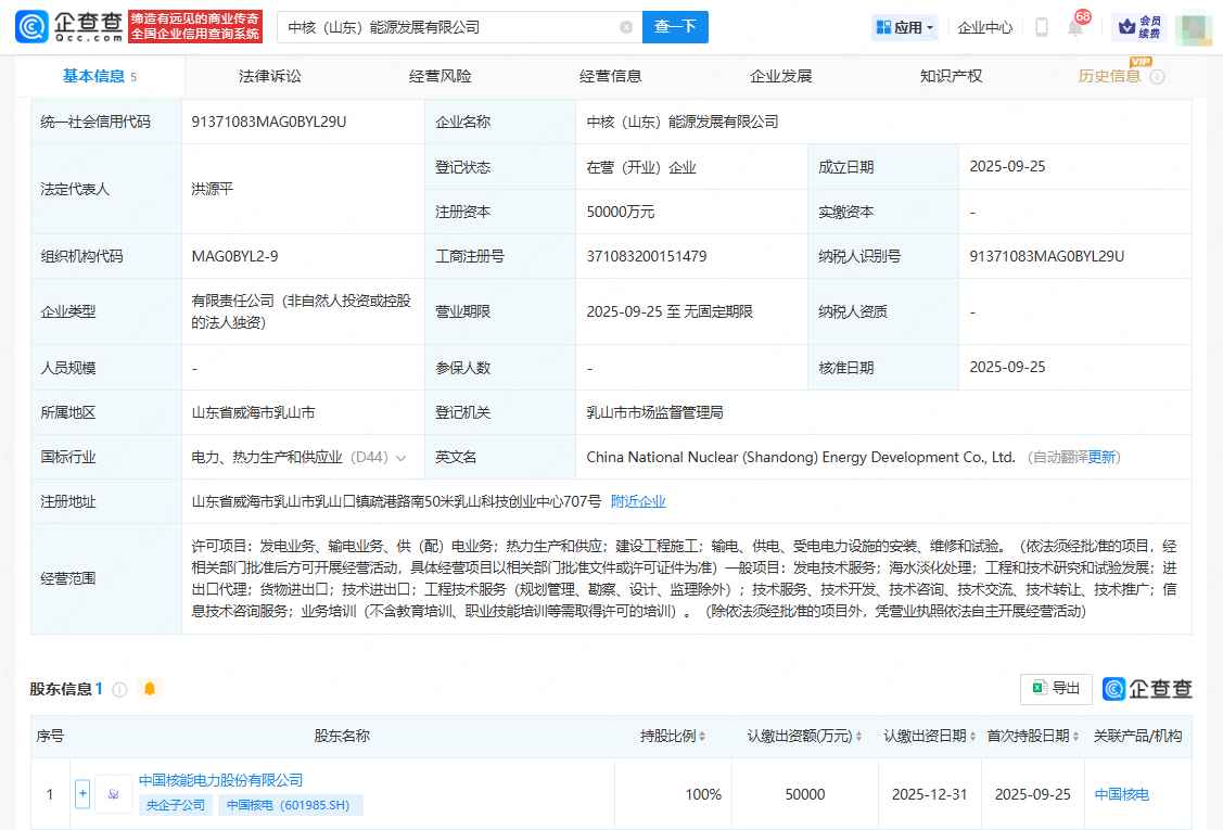 近日,中核(山东)能源发展有限公司成立同花配资,法定代表人为洪源平,注册资本5亿元人民币,经营范围包括发电技术服务、海水淡化处理、工程和技术研究和试验发展、进出口代理等。企查查股权穿透显示,该公司由中国核电(601985)全资持股。